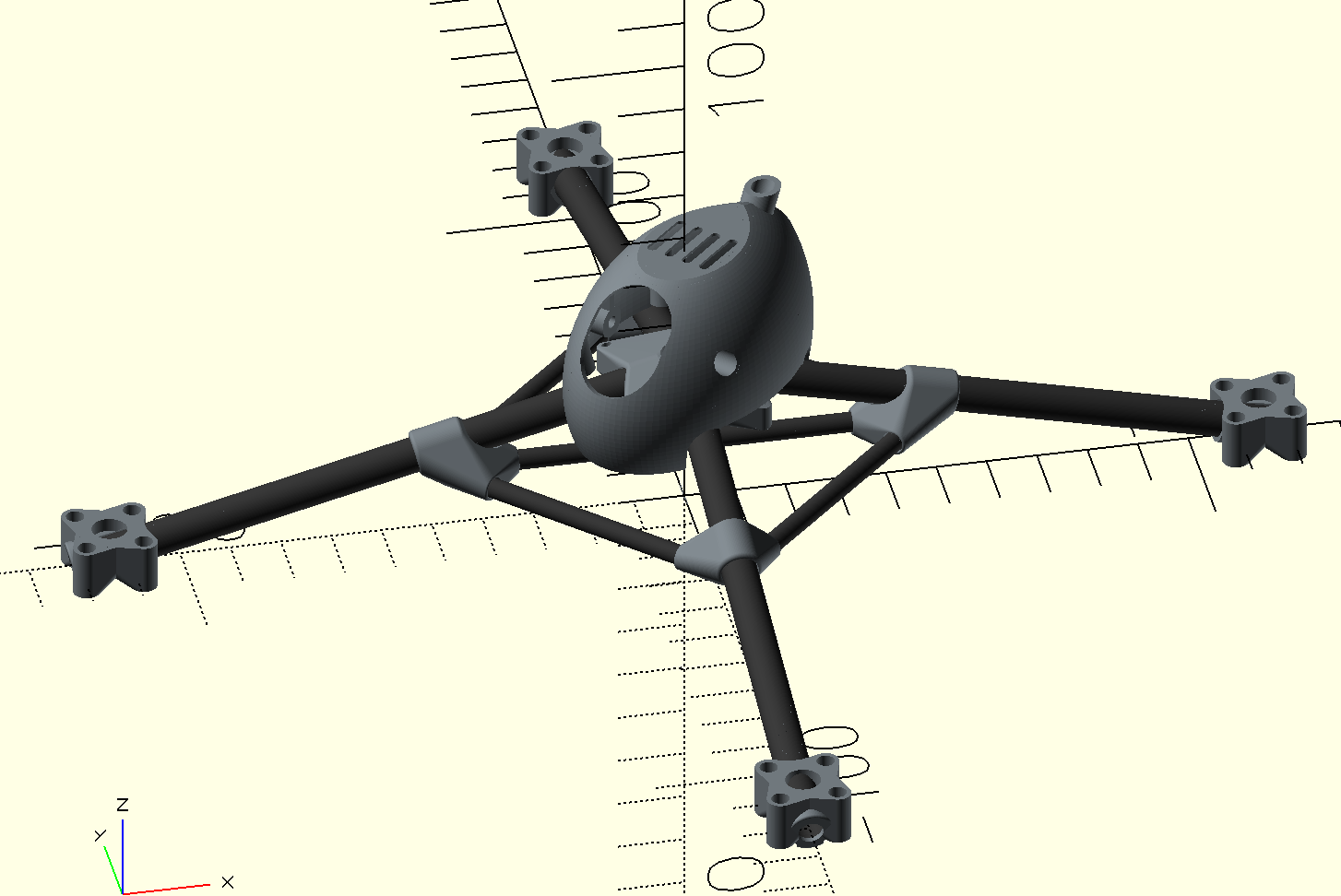 Test fit by inserting arm tubes (already with attached motor mounts) through the corners and joining them together with the central top node. The best way to do it is to first put 2 arm tubes through the smaller corner nodes (the ones joined by just 2 perimeter tubes, without the diagonal tube), and join them with the central node. You can then use the cable hole in the central node + diagonal tube below it to visually center the arm tubes - put the remaining 2 arm tubes through the bigger perimeter corners afterwards and join them in the central node as well. They should fit easily without excessive force and you should be able to easily rotate the arm tubes when the whole frame is assembled. Put the frame on flat workbench, arm ends with motor mounts should be level when they rest on motor bolt heads and frame shouldn't be twisted, all 4 arm ends should be touching the bench.